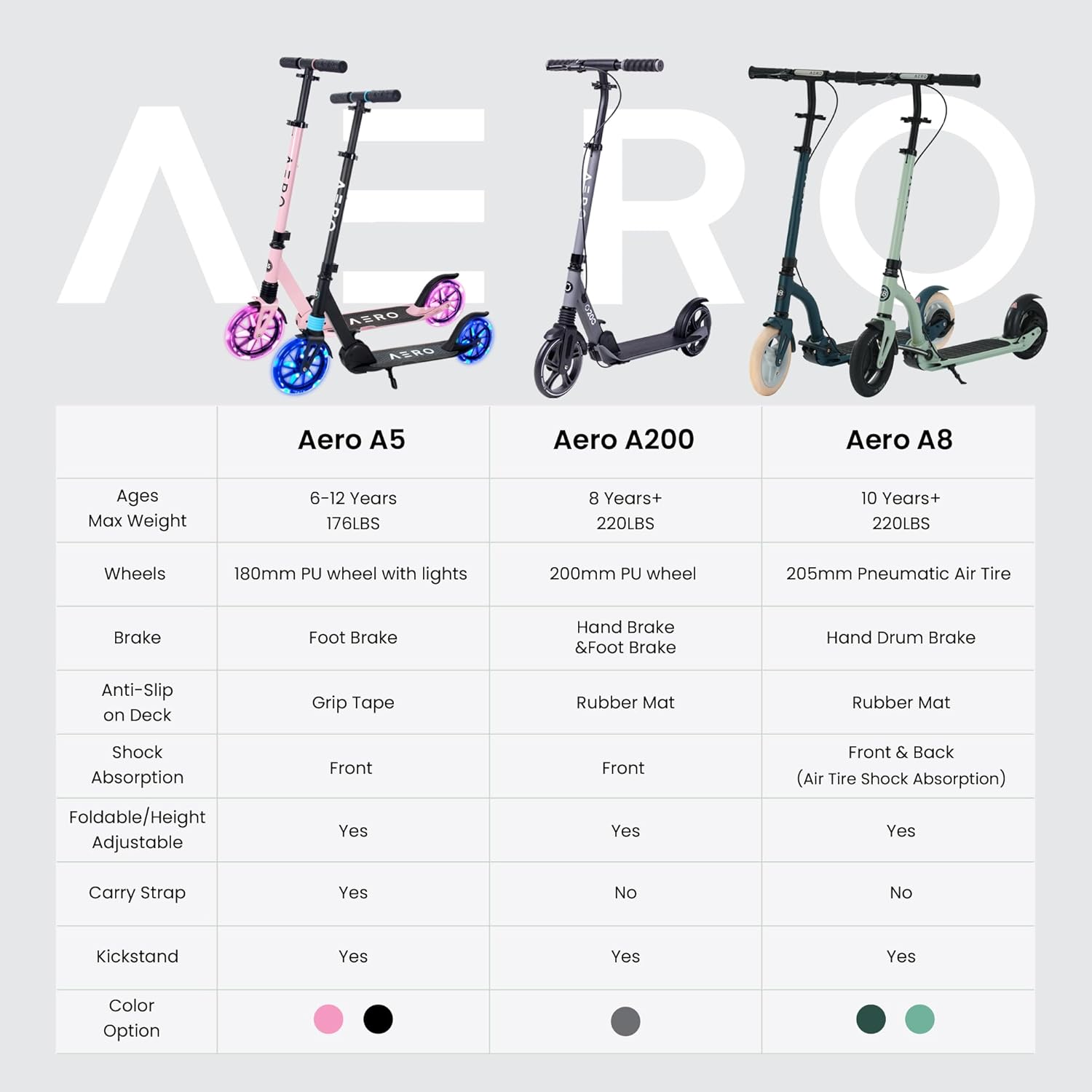 Be the first to review “Aero Big Wheels Kick Scooter for Kids 6+, Teens & Adults | Light Up Wheels, Hand Brake, Rubber Deck Mat & Shock Absorption | Foldable & Height Adjustable”