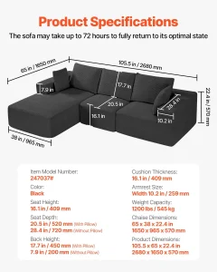 Be the first to review “Modular Sectional Sofa L Shaped Cloud Couch with Chaise and Cushion Black”